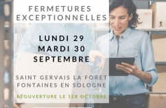 Nos sites de SAINT GERVAIS LA FORET et FONTAINES EN SOLOGNE seront fermés pour inventaire le lundi 29 et le mardi 30 septembre.